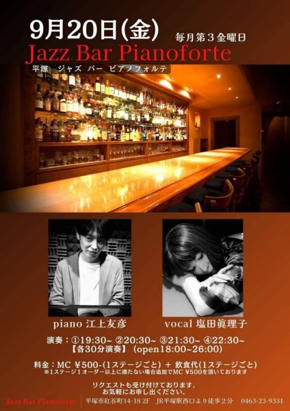 9月20日(金)に、Jazz bar Pianoforteで特別な夜をお過ごしください。ピアニスト江上友彦とボーカリスト塩田真理子による心温まるジャズ演奏をご堪能いただけます。