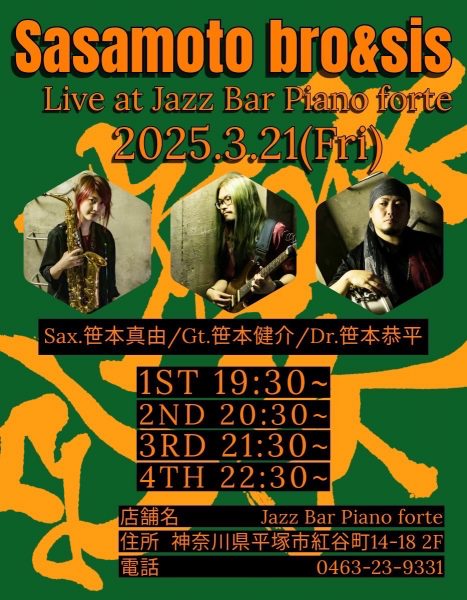 本日3月21日、特別な夜を音楽とともに過ごしませんか?当バーでは、素晴らしいサクソフォン奏者 笹本真由、ギターの名手 笹本健介、そしてリズムをたたき出すドラムス 笹本恭平が、心をこめた演奏で皆様をお迎えします。