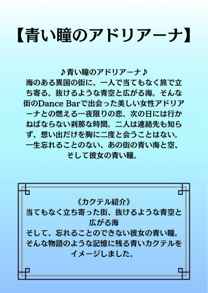 本日は、前回もご紹介した特別なカクテルとノンアルコールカクテル、アドリアーナとリブロをご紹介します。アドリアーナはその名の通り、忘れられない青がテーマ。パールパウダーを使用したリキュールを取り入れ、光り輝くラメのような美しさを演出しています。ベースはカサーシャにライチとトニックを合わせ、スムーズな味わいに。