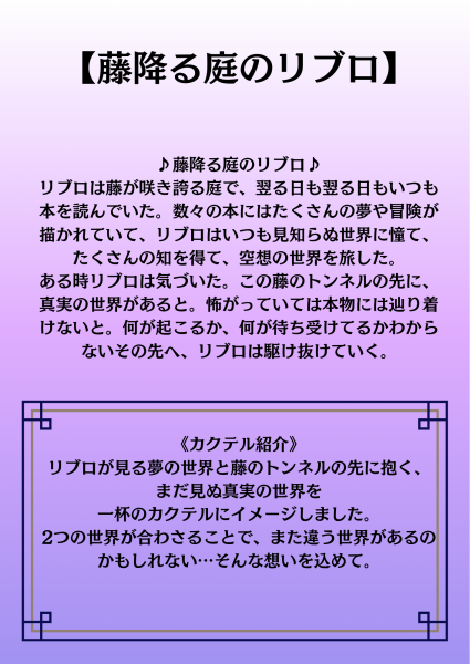 リブロは色が織りなす世界観が特徴のレモネードになっております。青紫、白、そして混ぜた後の藤色と、3色を楽しむことができます。ノンアルコールドリンクとして、健康を気にする方も安心してお楽しみいただけます。