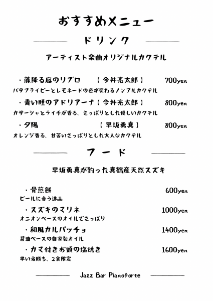 今日は特別な夜をお楽しみいただける、本日限定のオススメメニューをご紹介いたします。当店自慢のお二人によるオリジナルカクテルと、早坂勇真さんが釣り上げた新鮮な天然スズキを使用した料理をご用意いたしました。特に新鮮なスズキを使用した料理は数量限定ですので、お早めにお越しいただくことをおすすめします。この特別なメニューをお見逃しなく、ぜひ皆様で素敵なひと時をお楽しみください。スタッフ一同、皆さまのご来店を心よりお待ちしております。お洒落な空間で、特別なカクテルと料理に舌鼓を打ちながら、くつろぎの時間をお過ごしください。