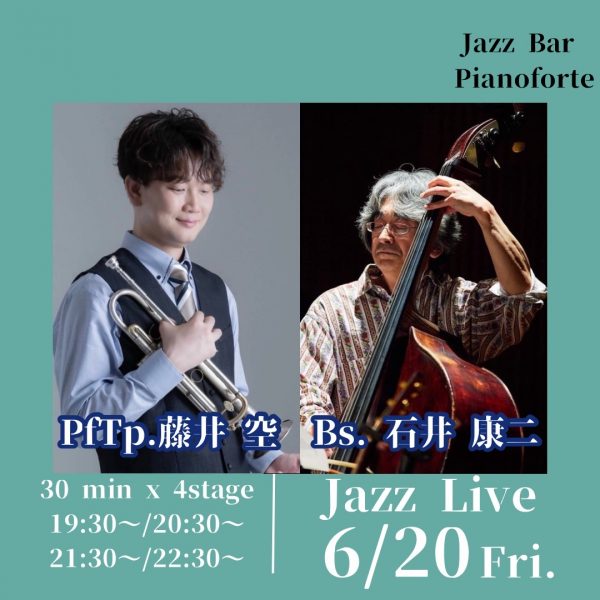 📢✨ 本日ライブのお知らせ ✨📢🎹🎺 藤井空(Pf / Tp) × 石井康二(Bs)